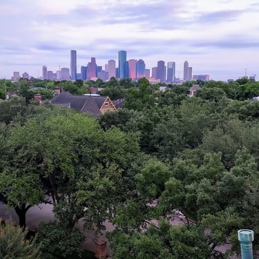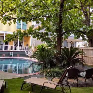 The home is 3,300 air conditioned square feet between the three-story main house and the finished garage apartment which sits above a large two car garage (including under stair storage). The home has five bedrooms (or office spaces), two full bathrooms, two three-quarter bathrooms, and one powder room. The home has wood floors except in the two guest bedrooms (carpeted), two bathrooms, and two utility rooms. The home has a significant amount of covered outdoor space including a large half-wrap front porch, back porch, two balconies, and a one-of-a-kind accessible rooftop deck! (with spectacular downtown skyline views). There is also a large swimming pool, back patio, and back yard astroturf, as well as a long driveway for entertaining.