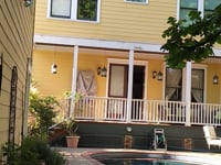 The home is 3,300 air conditioned square feet between the three-story main house and the finished garage apartment which sits above a large two car garage (including under stair storage). The home has five bedrooms (or office spaces), two full bathrooms, two three-quarter bathrooms, and one powder room. The home has wood floors except in the two guest bedrooms (carpeted), two bathrooms, and two utility rooms. The home has a significant amount of covered outdoor space including a large half-wrap front porch, back porch, two balconies, and a one-of-a-kind accessible rooftop deck! (with spectacular downtown skyline views). There is also a large swimming pool, back patio, and back yard astroturf, as well as a long driveway for entertaining.